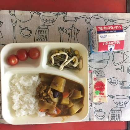 今日の献立は、豚肉と金時豆のカレーライス、ごぼうサラダ、プチトマト、牛乳でした。