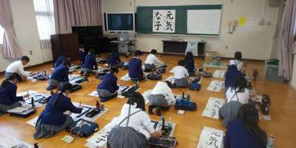 4年生の書写の学習です。子どもたちは、ゆっくり、ていねいに筆を動かし、集中して「元気な子」と書いていました。