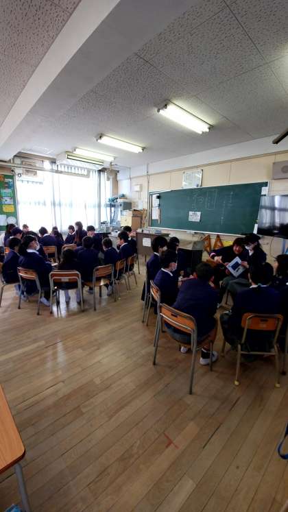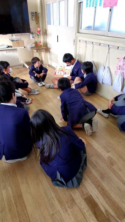 今朝は各たてわり班教室での読書集会。集会委員会と図書委員会との共同企画です。今回は、5年生の児童が読み聞かせを行いました。どの班も物語の世界を楽しむことができました。