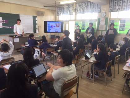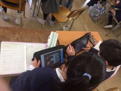 タブレットを使って、昔の暮らしと今の暮らしの変化を発表するためのプログラミング学習をしました。