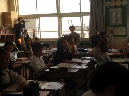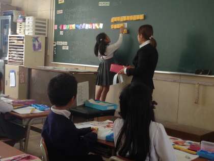 11月11日(火)5時限目に1年2組で算数科の授業研究会が行われました。単元は「ひきざん」。15−8の計算のしかたを考える学習です。子ども達は、ブロックや図を使いながら答えを考え、自分の考えた方法を堂々と発表していました。一人一人の子ども達がとても一生懸命学習に取り組んでいました。