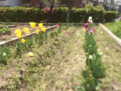 遊びの広場には、チューリップが咲き誇っています。今から20年くらい前に見た富山のチューリップ祭りには遠く及びませんが…