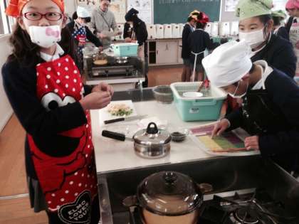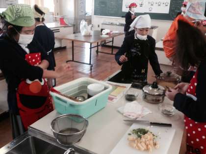 12月2日(火)5年2組は家庭科の調理実習を行いました。作ったのは、ごはんと味噌汁です。ごはんは、炊けていく様子がよくわかるようにガラスのなべで炊きました。子ども達は、だしに使うにぼしの処理をしたり、ネギ、うすあげなどを切ったりする作業をグループの友達と協力しながら進めていました。さて、おいしくできたでしょうか。1組の調理実習は、今週の木曜日の予定です。