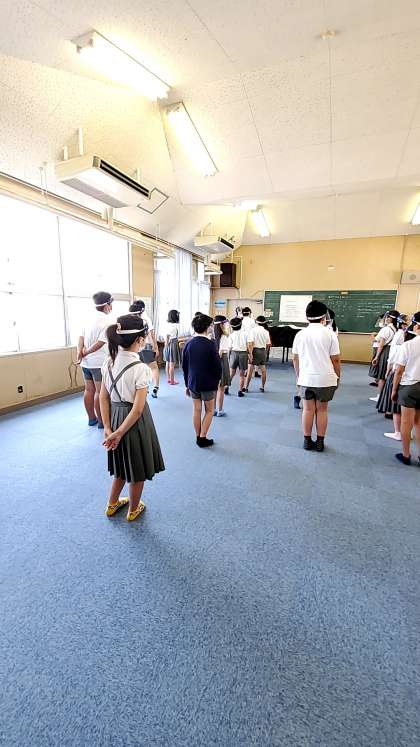 6年生は、音楽の授業。フェイスシールドとマスクをつけての発声練習。少し、声は出しにくいけれど、一生懸命に練習に励んでいました。