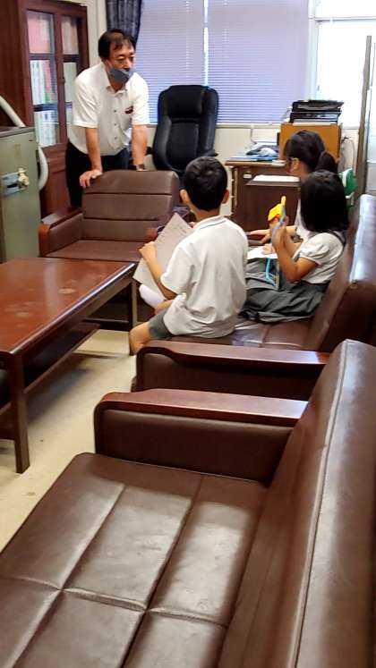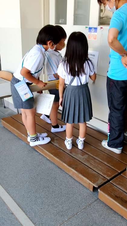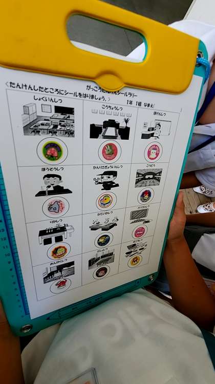 今日の2時間目は1・2年生の学校探検。上級生である2年生が、1年生に学校を案内しました。校長室、職員室、管理作業員室、保健室、放送室、理科室などたくさんの部屋を回りました。2年生は事前に説明の練習をし、部屋の前にはクイズを作成するなど一生懸命に準備をしてきました。1年生は、2年生と一緒に校内を回り、シールを集めたり、あさがおの種と手紙のプレゼントをもらったりしてとても嬉しそうでした。
