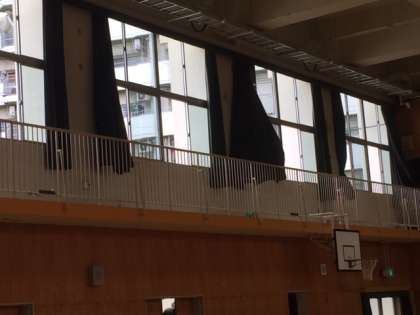 3密を避けるため、窓を開けていますが、外は突然の突風です。体育館のカーテンもダンスの授業のように踊っていました。