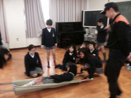 12月6日(土)土曜授業で防災学習に取り組みました。東淀川消防署、区役所の方が中心となって、各町会の防災リーダーの方にも協力していただきました。はじめに全校で防災に関するDVDを見てから、1年生から3年生は、○×クイズ、防災ダックをしました。防災ダックというのは災害が発生した時にとっさに行わなければならない行動をゲーム化したものです。また、4年生から6年生は、煙体験、消火器訓練、担架づくりなどを行いました。最後に消防署の方に出動時の着装訓練も見せてもらいました。子ども達は、それぞれのブースでいろいろと教わりながら、真剣に取り組んでいました。