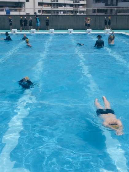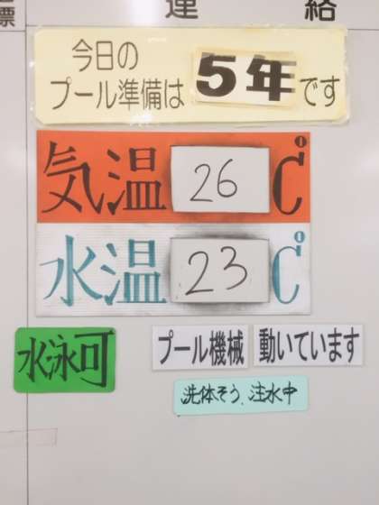 急遽明日と授業を入れ替えて、今日、プールに入りました。また、水は冷たく、少し寒かったと思います。