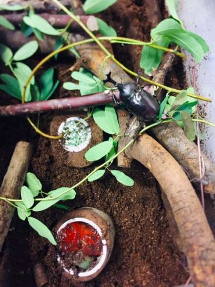 写真は一匹だけですが、かぶと虫は夜行性。多くはおがくずの中でお昼寝です。写真撮影のために一匹だけ出勤してもらいました。ごめんなさい。