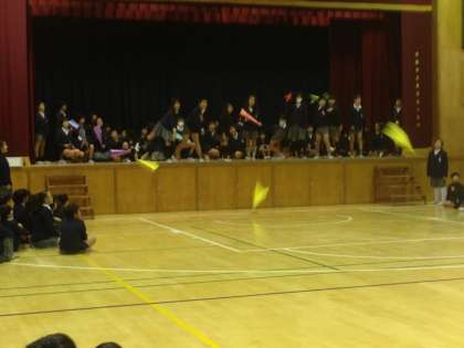 12月11日(木)今日の児童集会は、集会委員会が担当で「紙飛行機大会」をしました。縦割り班で集合して、班で一つ紙飛行機を折って舞台の上から飛ばしました。子ども達の歓声とともに紙飛行機は舞い上がり、とても楽しい集会になりました。