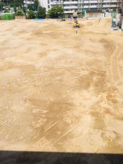 今、運動場は地面を平らにする作業をしてえますが、雨で地盤が丁度いい具合に落ち着きました。最後にはトラックなどのマーカーを埋め込みます。