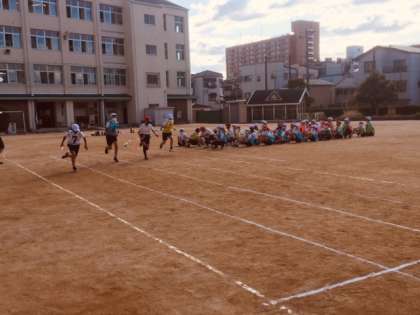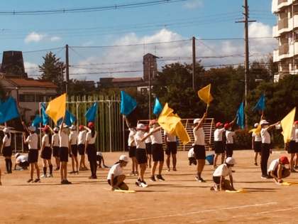 準備体操、リレー、フラッグと