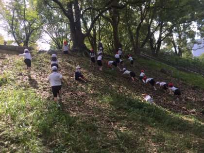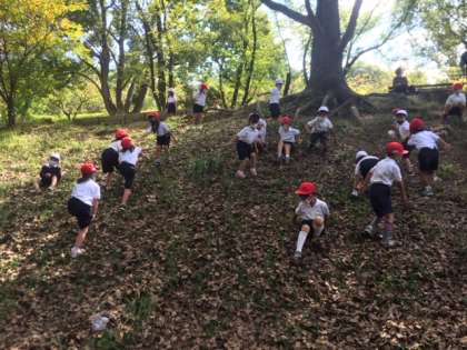 どんぐりや松ぼっくりを拾ってから、自然の中で滑り台。