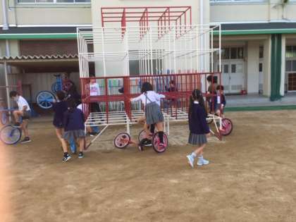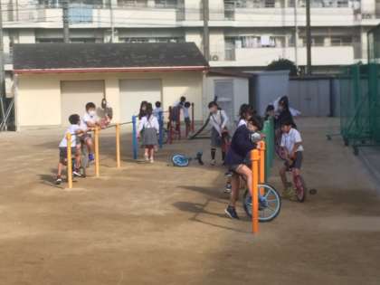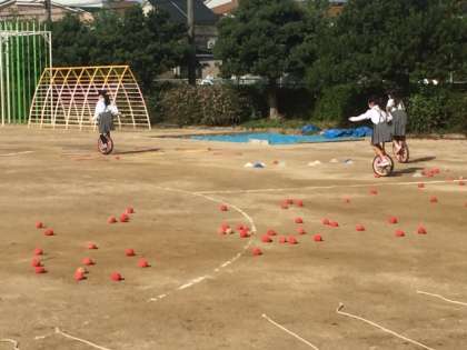 2年2組が一輪車の練習をしています。まだまだ乗りこなせる子どもは少ないですが、みんな頑張ってチャレンジしています。