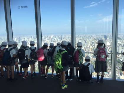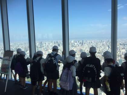 班に分かれて展望を楽しんでいます。でも、高い所が苦手な子もいます。窓から離れてみてください。赤帽は1組、白帽は2組です。