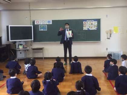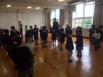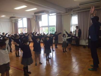 自己紹介を兼ねて、歌やダンスを交えながら、子どもたちと楽しく授業を進めてくださっていました。子どもたちも、臆することなく英語で話ができていました。