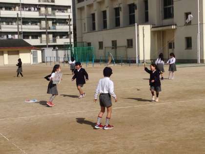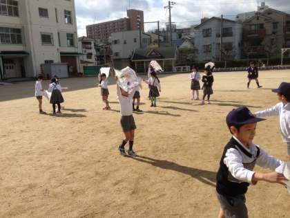1月28日(水)1年生は運動場でたこあげをしました。生活科の時間に自分たちで作って絵を描いたこをあげました。はじめは、二人組になってあげていましたが、だんだんと慣れてくると一人でもあげられるようになりました。寒い中、子ども達の元気な声が運動場に響き渡っていました。