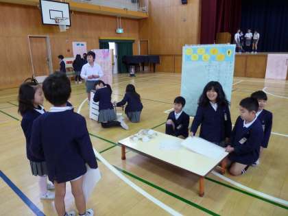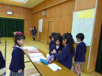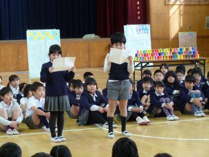 1月23日(金)講堂で2年生が「おもちゃランド」を開きました。生活科で作ったおもちゃを使って遊びのコーナーを作り、1年生を招待して楽しんでもらいました。風で動くおもちゃをはじめ、ゴムで動くおもちゃや空気の力で動くおもちゃなど、さまざまな仕掛けで動くおもちゃにふれ、1年生は大喜びでした。2年生も自分の役割をしっかり果たすことができました。