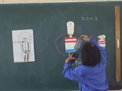 キットを使って懐中電灯を作ります。豆球に電気をつけるには電気の通る輪を作ります。電気の通る道を回路と言います。説明を聞いて、実際に作ります。