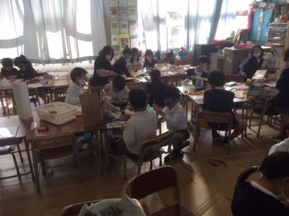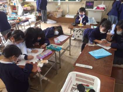 遠足で拾ったドングリを使って、ドングリおもちゃ屋さんの準備です。