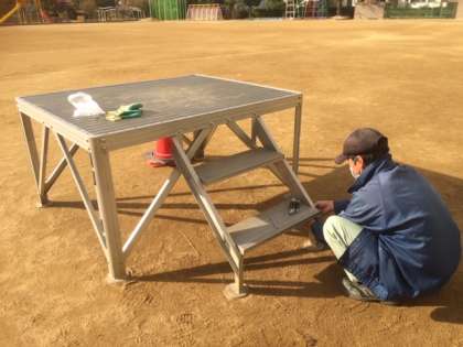 今朝、朝礼台に登ったときに階段にぐらつきを感じました。見てみるとネジが1ヶ所外れています。すぐに管理作業員さんにお願いしたところ、早速修理完了。