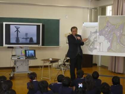 2月4日(水)3時限目、3年生は地域に住んでおられる野畑一雄さんから豊里南地域の昔の様子についてお話を聞きました。縄文時代の昔から昭和の時代にかけての豊里南地域の地形、淀川の様子、くらしぶり、子どもの遊び、学校生活の様子などについて地図や写真を使って説明していただきました。子ども達は質問をたくさんしていました。地域の昔の様子がよくわかりました。本当にありがとうございました。