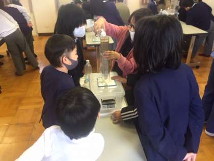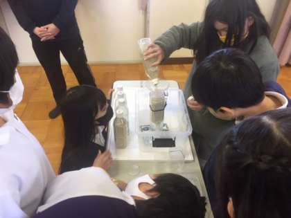 全体的な説明の後、川砂を通してろ過しゴミや汚れを取り除いきます。実際に浄水場で行なっている工程と同じです。見た目は随分と綺麗になりました。
