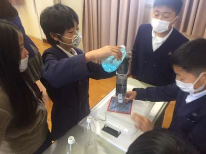 次に活躍するのは粒状活性炭です。石炭を細かく砕き、そこをろ過させます。今日の実験では臭いの代わりに青い色をつけましたが、見事に透明に戻りました。