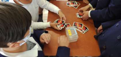 今日の未明まで雨が降っていたので、今日の15分休憩は外で遊ぶことができませんでした。残念…。そのかわりに、本を読んだり、カードゲームをしたり、クラスでゲームをしたり、お友達とお話をしたり、それぞれが教室や廊下で楽しい時間を過ごしました。