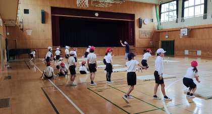 4年2組の体育の授業の様子です。今日は講堂で立ち幅跳びに取り組んでいました。しっかり腕を振って斜め上を目指してジャンプ!しっかり、遠くへ跳ぶことができたかな。