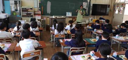 10時45分からプリントなどを利用した、家庭で学習した内容を深める指導を行っています。2年生は算数や国語のプリントの確認などを行っていました。そのあと給食です。静かに前を向いて食べることができています。(1年生は海苔の袋をあけるのに苦労していました。)