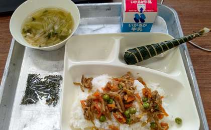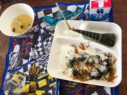 「こどもの日の行事献立」です。ちまきは米の粉などで作ったもちを笹の葉につつみ、蒸して作る和菓子です。「こどもが元気に育ちますように」という願いをこめて食べます。