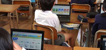 今週末に端末を持ち帰り、家庭での接続テストを行う予定です。その準備のため各学級で端末を作動する練習を行っています。