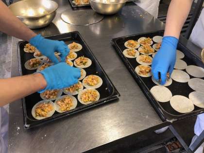 です。変わりピザは餃子の皮を使っています。ツナ缶、細切りチーズ、コーン、ピーマン、ピザソースを混ぜ合わせ、給食室で1枚ずつたねをのせて、焼き物機で焼いています。