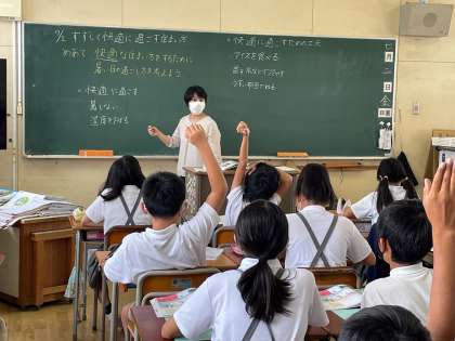 「すずしく快適に過ごす住まい方」について、児童たちは活発に意見を出し合い学習することができました。写真はその授業の様子です。