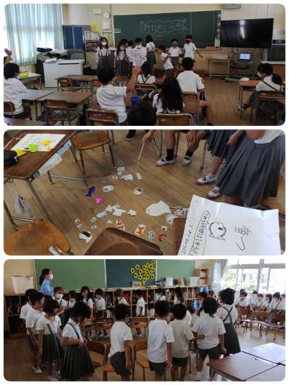 1学期終了まであと2日。今日は多くのクラスでお楽しみ会を開催しています。クラスのみんなでクイズを考えたり、ゲームを考えたり、とても楽しそうに過ごしていました。