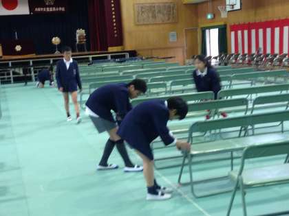 4月6日(月)新6年生と教職員が明日の入学式の準備を行いました。玄関やろうか、講堂のそうじやイスならべなどをしました。その後、新2年生が登校し、新入生の歓迎の演技の練習もしました。新6年生も新2年生も明日入学して来る1年生のために一生懸命頑張っていました。明日の入学式がとても楽しみです。