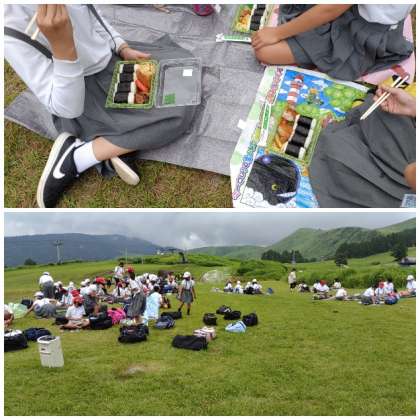 宿舎前の広場で昼食を食べました。自然の中で、そしてみんなで食べるごはんはとても美味しかったです。