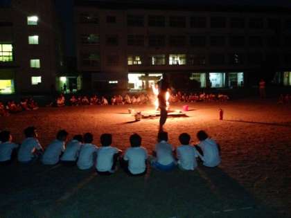 8月17日(土)、18日(日)豊里南小学校で野外活動の夕べ(校庭キャンプ)が行われました。4年生から6年生までの84名の子ども達が参加し、夕食のカレーライス作り、キャンプファイアー、きもだめし、校庭の草取り、ビンゴゲーム等の活動を行いました。