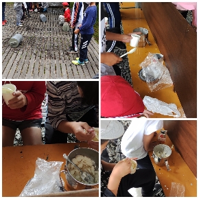 部屋の片付けのあと、学年写真を撮り、アイスクリームづくりをしました。昼食のあと、閉舎式になります。これですべての活動が終了します。子どもたちは楽しい思い出をたくさん作ってくれたようです。