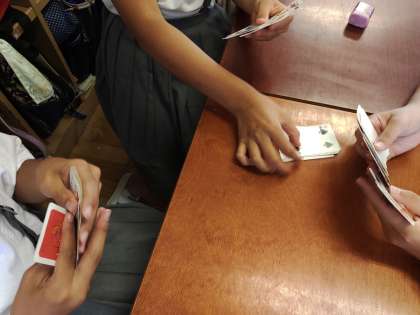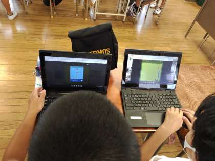 昨日に続き、今日は朝から雨が降っているので運動場に出ることはできません。子どもたちは教室でトランプをしたり、一人一台端末を使って遊んだりしていました。みんな楽しく校舎内で工夫して遊んでいました。