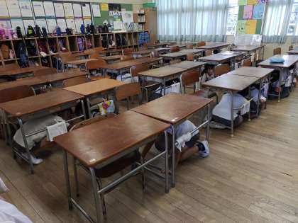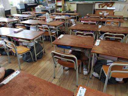 避難訓練を大阪880万人訓練に合わせて行いました。大雨警報が大阪に出ていたため大阪880万人訓練は中止となりましたが、13時30分、豊里南小学校では地震が発生したと想定して訓練を行いました。万が一に備え、おしゃべりをせずに放送をしっかり聞くことができていました。写真は1年・2年が机の下で頭をまもっている様子です。