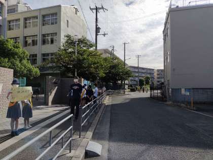 今月の生活目標は「進んであいさつをしよう」です。登校してきた児童たちに代表委員会のメンバーが元気よくあいさつをしていました。