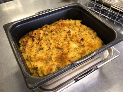 でした。今日のグラタンは、小麦や乳アレルギーの児童も食べられるように考えられた献立で、小麦粉の代わりに上新粉(米粉)を、牛乳やクリームの代わりに豆乳を使用しました。また、米粉のマカロニとパン粉を使用しました。カレー味で食べやすい味付けになっていました。