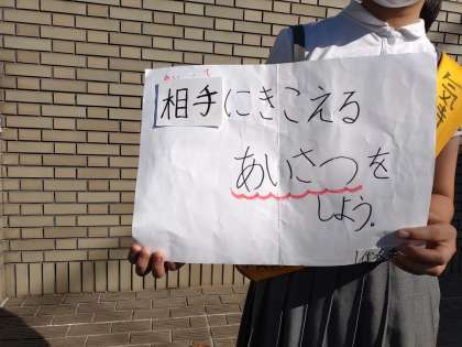 3連休明けの今日、とてもすがすがしい朝を迎えました。代表委員会のあいさつ運動が