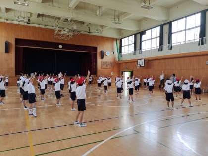 10月22日に延期となった運動会の練習が始まっています。1年と2年は合同で披露する団体演技の練習を行いました。それぞれの学年も運動会に向け準備をしています。