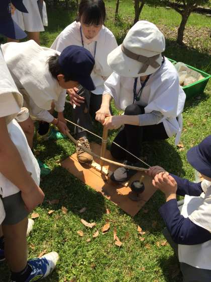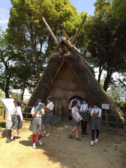 4月24日(金)6年生は、社会見学で田能遺跡へ行きました。竪穴式住居や高床式倉庫を見たり、貫頭衣を着て火おこし体験をしたりしました。資料館では土器なども見ました。とても良い天気に恵まれ、子ども達は昔の人のくらしを十分満喫して楽しんでいました。