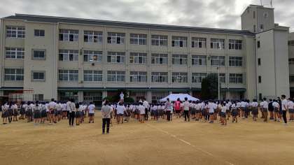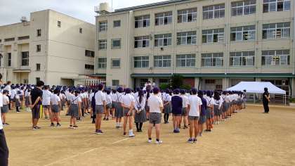 緊急事態宣言も解除されたので、今日から運動場に集合しての児童朝会となりました。