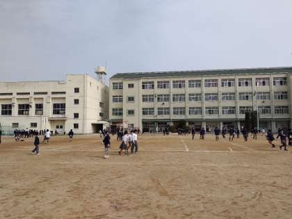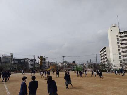 2月15日、昼休みの風景です。晴天で運動場も非常に良い状態でした。いつもより多くの子どもたちや先生方がドッジボール、なわとび、鬼ごっこ、一輪車、そして鉄棒などをして遊んでいました。広い運動場っていいなぁ。