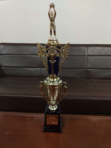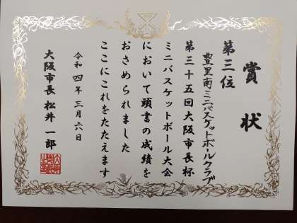 まず、ミニバスケットボールの児童の表彰を行いました。大阪市長杯で3位という素晴らしい成績を残しました。写真は賞状とトロフィーです。